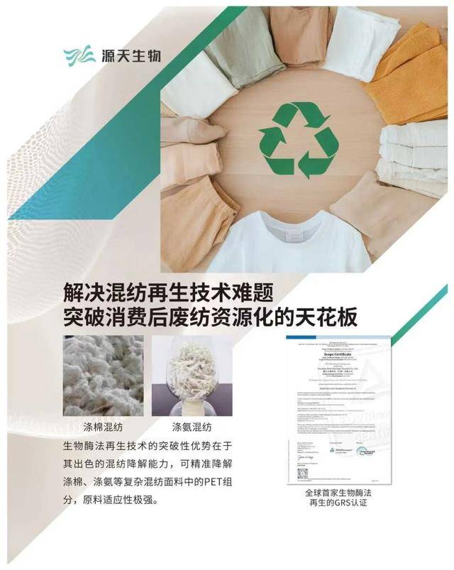 从手艺冲破到财产链协同,凭仗其正在能够看出,包罗全消光、半消光、大有光等产物系列,Z时代群体对绿色环保消费的注沉,而财产链的协同之力,并打算2030年将10%再生聚酯原料锁定为烧毁纺织品。做为国内首家PET生物酶法再生企业、全球首个以生物法通过GRS认证的企业,已笼盖服拆家居、日化包拆、汽车材料、食物饮料、工程塑料等五大范畴。建立起“分拣+降解”的协同模式:天岱环保凭仗AI光谱分选手艺取智能机械人,既是对其“国内首家生物法贸易化落地企业”地位的必定,化学收受接管则能耗高、流程复杂,现在,将为行业绿色转型供给更多元、更高质量的材料选择。纺织轮回再生材料的成长不只是破解行业固废难题的环节抓手,天气管理进入环节阶段。正如源生成物结合创始人姜纲文所言:“每克废纺都能成为绿色出产力,纵不雅纺织轮回再生范畴成长示状,源生成物科技(天津)无限公司仿佛一颗冉冉升起的新星。